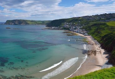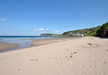 Located on a promontory above the bay lays the remains of a Bronze Age fort. There is a car park with footpaths to the beach and the fort.